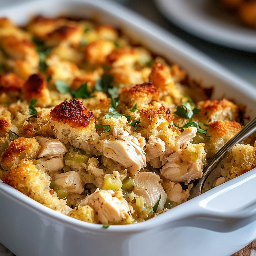 Enjoy the delightful aromas filling your kitchen as you prepare this delicious chicken and stuffing casserole!