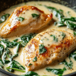 Creamy garlic chicken with spinach is a comforting and flavorful dish that transforms an ordinary dinner into an extraordinary experience. Tender chicken breasts are enveloped in a rich, velvety sauce made from fresh garlic, creamy heavy cream, and vibrant spinach. This one-pan wonder is not only easy to prepare but also visually stunning, making it perfect for cozy family nights or entertaining guests. With every bite, you’ll savor the delightful blend of flavors that will leave everyone asking for seconds.